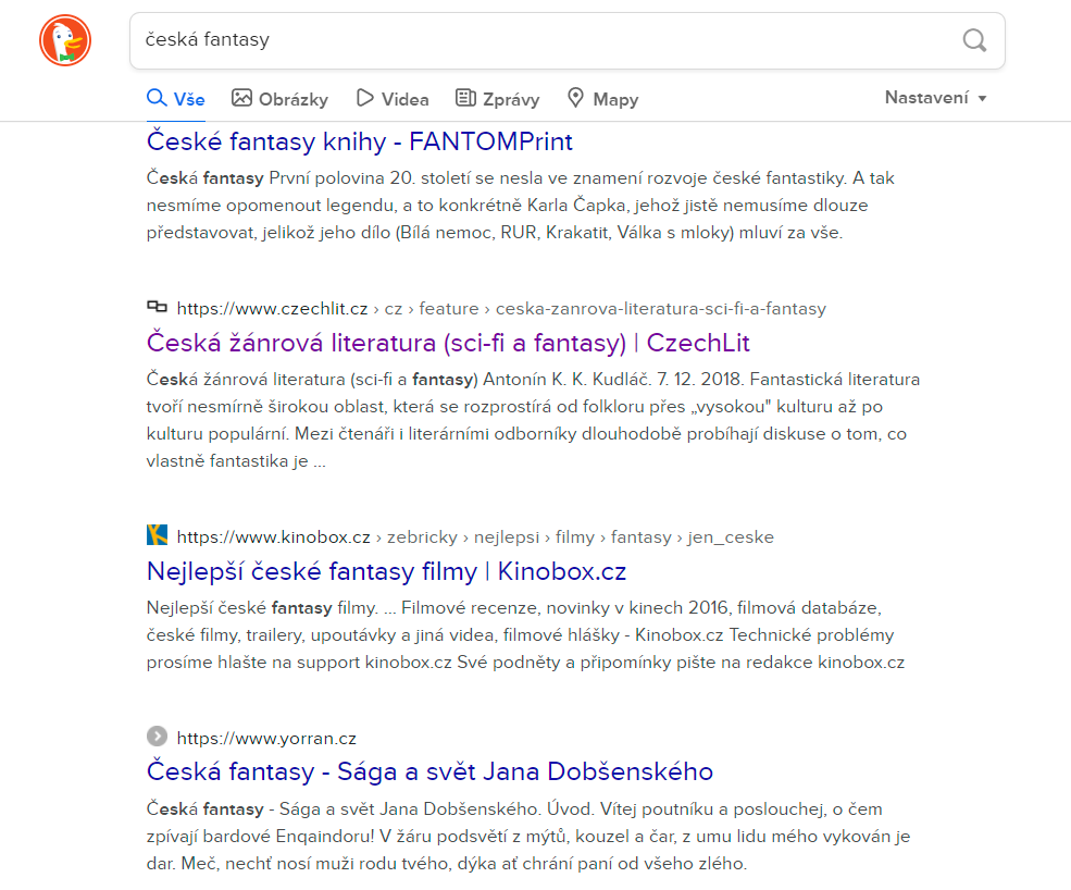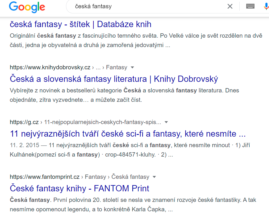 Nejdříve jsem česká klíčová slova prohnala oběma vyhledávači. Jak jsem očekávala, výsledky byly odlišné. Přišlo mi, že vyhledávač od Googlu nejdříve nabízel odkazy na internetová knihkupectví a až poté pro mě relevantní stránky. Přikládám na srovnání vyhledávání klíčového slova česká fantasy: