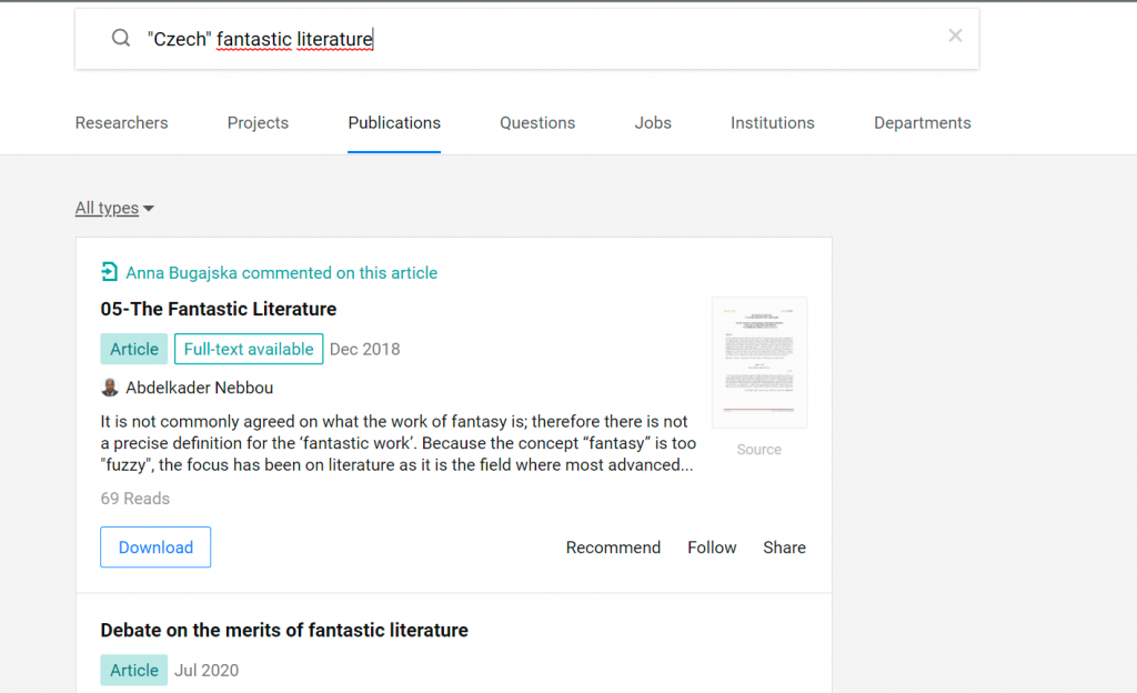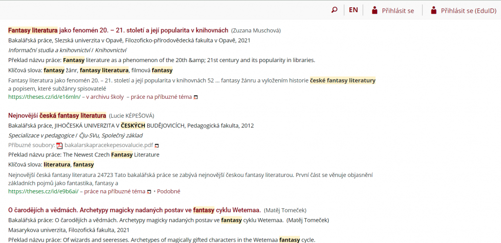 Mé téma je značně omezeno okruhem dostupných textů. Bylo mi jasné, že původní texty v angličtině o vývoji české fantasy nenaleznu. A samotné vyhledávání mou hypotézu jen potvrdilo. Nejvíce výsledků bylo v případě portálu Theses. Co mě ale překvapilo, byly výsledky na portálu ResearchGate. Očekávala jsem, že jako první bude studie Terezy Dědinové a i přes různé obměny klíčových slov a zadaných operátorů mi vycházela až na třetím místě.